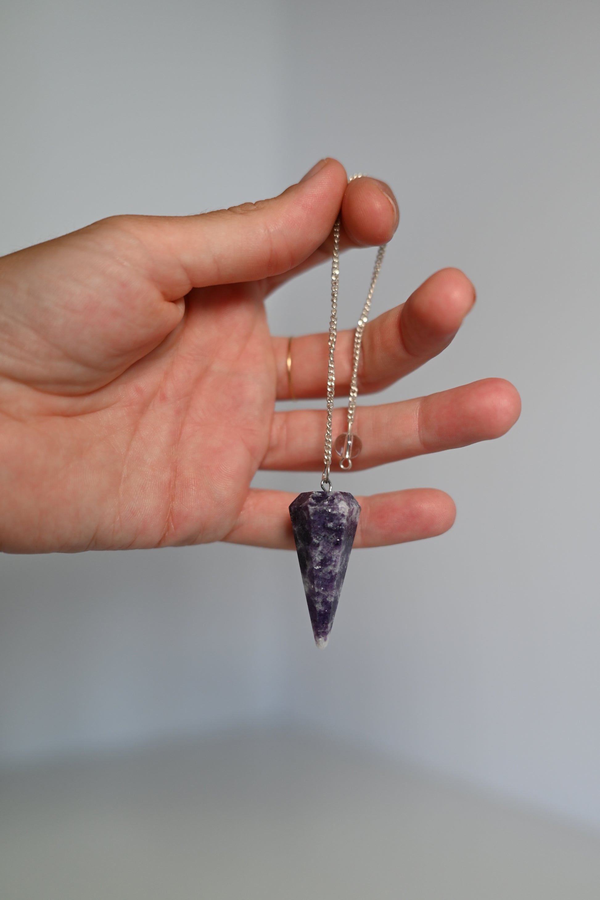 Péndulo de Lepidolita facetado y pulido, ideal para radiestesia, meditación y trabajos de intención. Presenta tonos lila/lavanda con brillo nacarado característico de las micas. Incluye cadena. Se vende por unidades. El producto recibido es similar al de las fotografías.