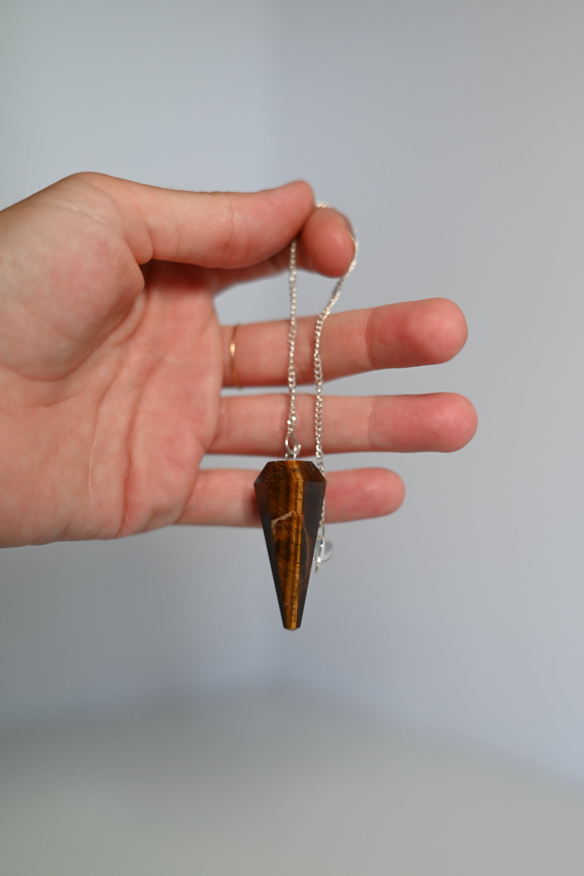 Péndulo de Ojo de Tigre facetado y pulido, ideal para radiestesia, meditación y trabajos de intención. Presenta el característico efecto chatoyance con vetas doradas y marrones. Se vende por unidades. El producto recibido es similar al de las fotografías.