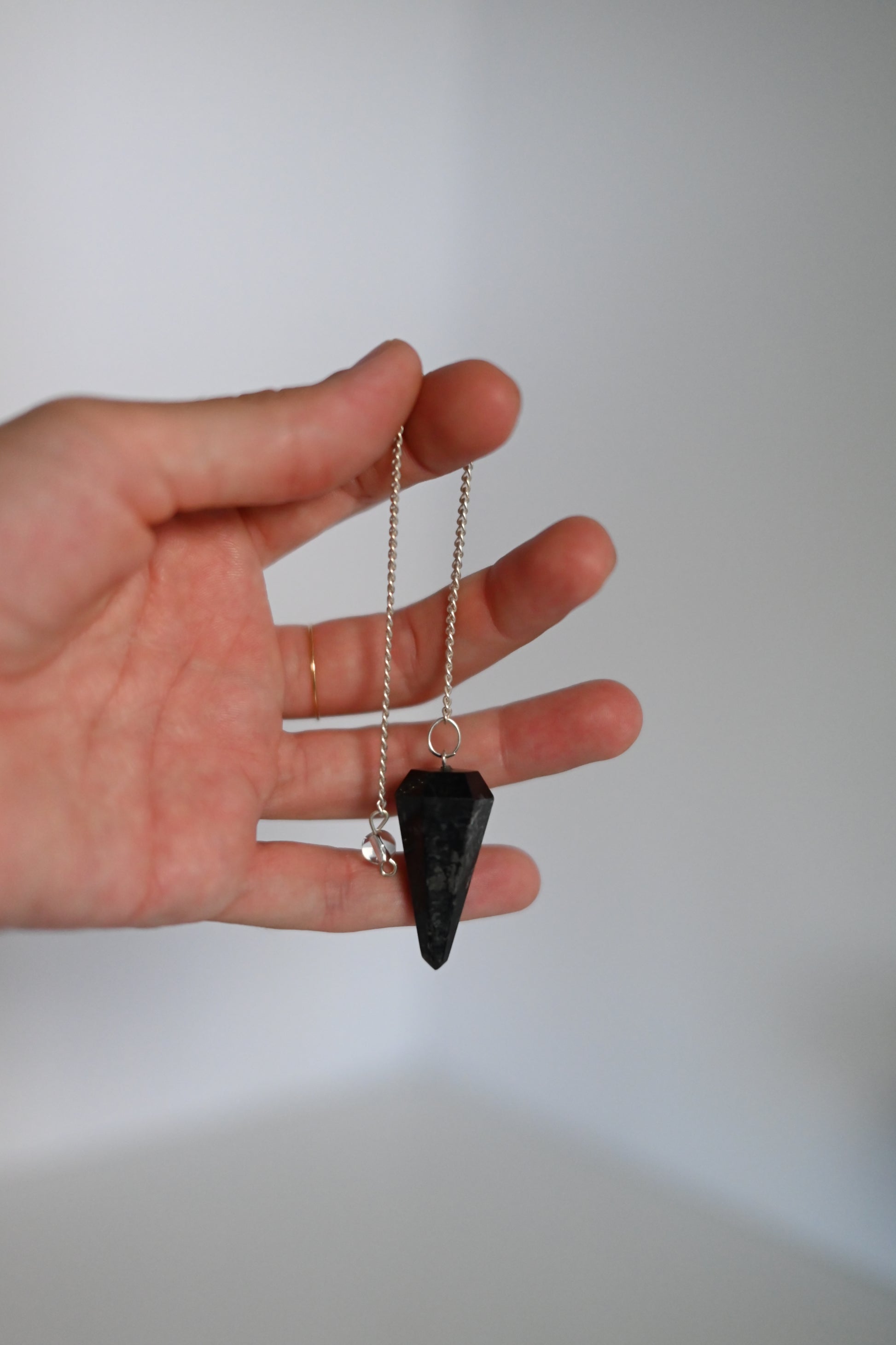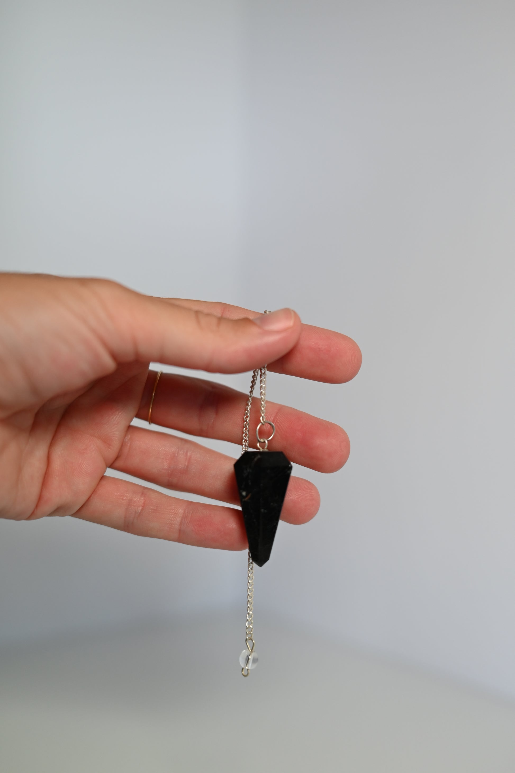 Péndulo de Turmalina facetado y pulido, ideal para radiestesia, meditación y trabajos de intención. Presenta el tono profundo característico (habitualmente negro) y brillo natural. Se vende por unidades. El producto recibido es similar al de las fotografías.